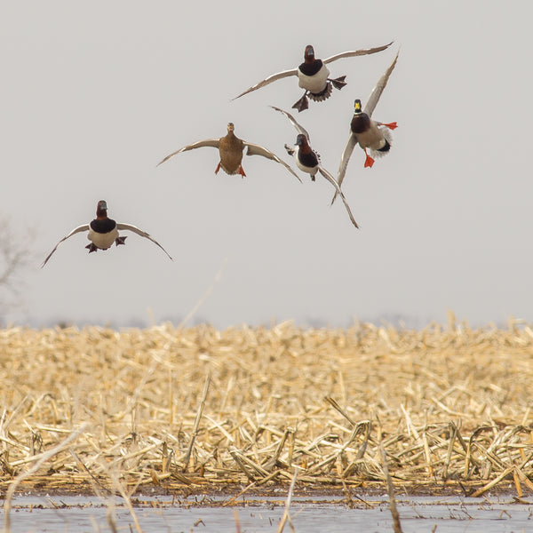 Mallards and Canvasbacks getting down into a flooded, picked cornfield.